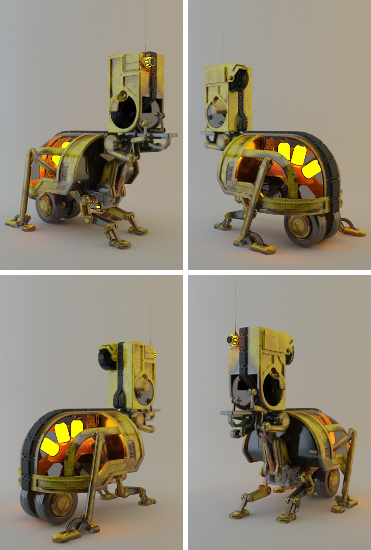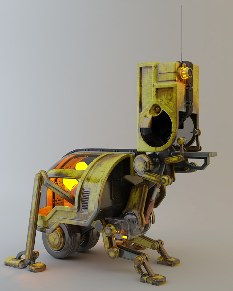 A-bot: For this design I used reference of a grasshopper, a beetle and and a chipmunk holding a nut. Besides the modelling part, the project was a good chance to learn about V-ray.